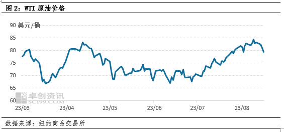 美原油價(jià)格從8月至今展現(xiàn)出沖高回落走勢,價(jià)格重心仍高于7月均值,對塑料市場起到托底作用。具體看,WTI原油主力合約價(jià)格從8月1號的80美元/桶升至10號的84美元/桶,最后下跌至8月17日的79美元/桶。上漲因素來源于8月3日沙特宣布把100/桶的減產(chǎn)計(jì)劃延長至9月,同時(shí)某國宣布將在9月繼續(xù)限制出口,進(jìn)一步鞏固了市場供應(yīng)偏緊預(yù)期。同時(shí)美國勞工部公布CPI數(shù)據(jù)低于市場預(yù)期,9月不加息可能性增加,導(dǎo)致原油價(jià)格上漲。后續(xù)市場連續(xù)四個(gè)交易日走弱,主要在于市場對于我國經(jīng)濟(jì)增長的不確定性以及對于美國進(jìn)一步加息的擔(dān)憂。綜合來看,原油作為成本端對塑料市場的托底效果正在邊際走弱。