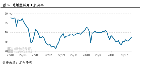 從行業(yè)角度來看,2023年7月我國塑料制品產(chǎn)量為651萬噸,環(huán)比下滑2.25個(gè)百分點(diǎn),在去年基數(shù)較低的情況下,累計(jì)同比增長0.5%,更微觀角度來說,我國塑料下游綜合開工負(fù)荷率有所下降,表明了我國塑料產(chǎn)品需求有所下移。